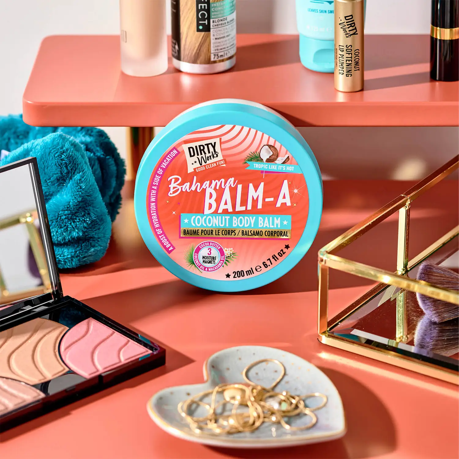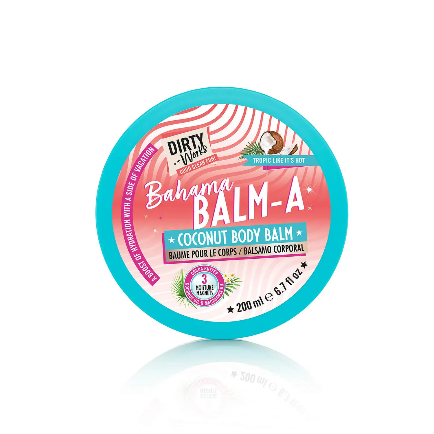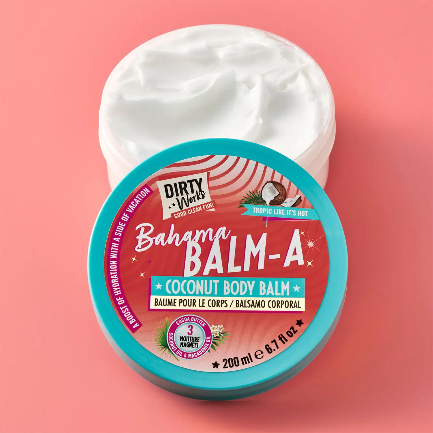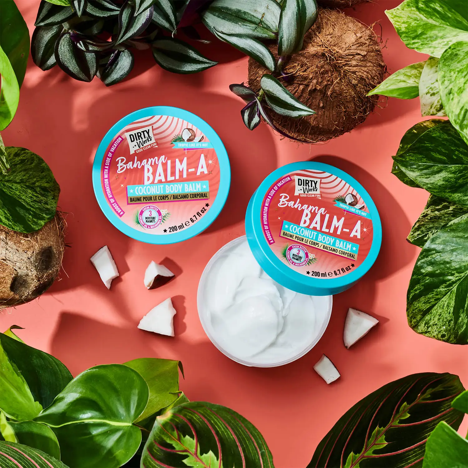 Introducing our Dirty Works Bahama Balm-A Body Balm, a luxuriously thick moisturiser for skin that’s crying out for hydration. Here to fight dry, flaky skin, it’s full of highly nourishing ingredients that effortlessly take your skin from thirsty to thriving. Formulated with Sweet Almond, Coconut and Macadamia Oils swirled together with Shea and Cocoa Butters to deeply hydrate parched skin.