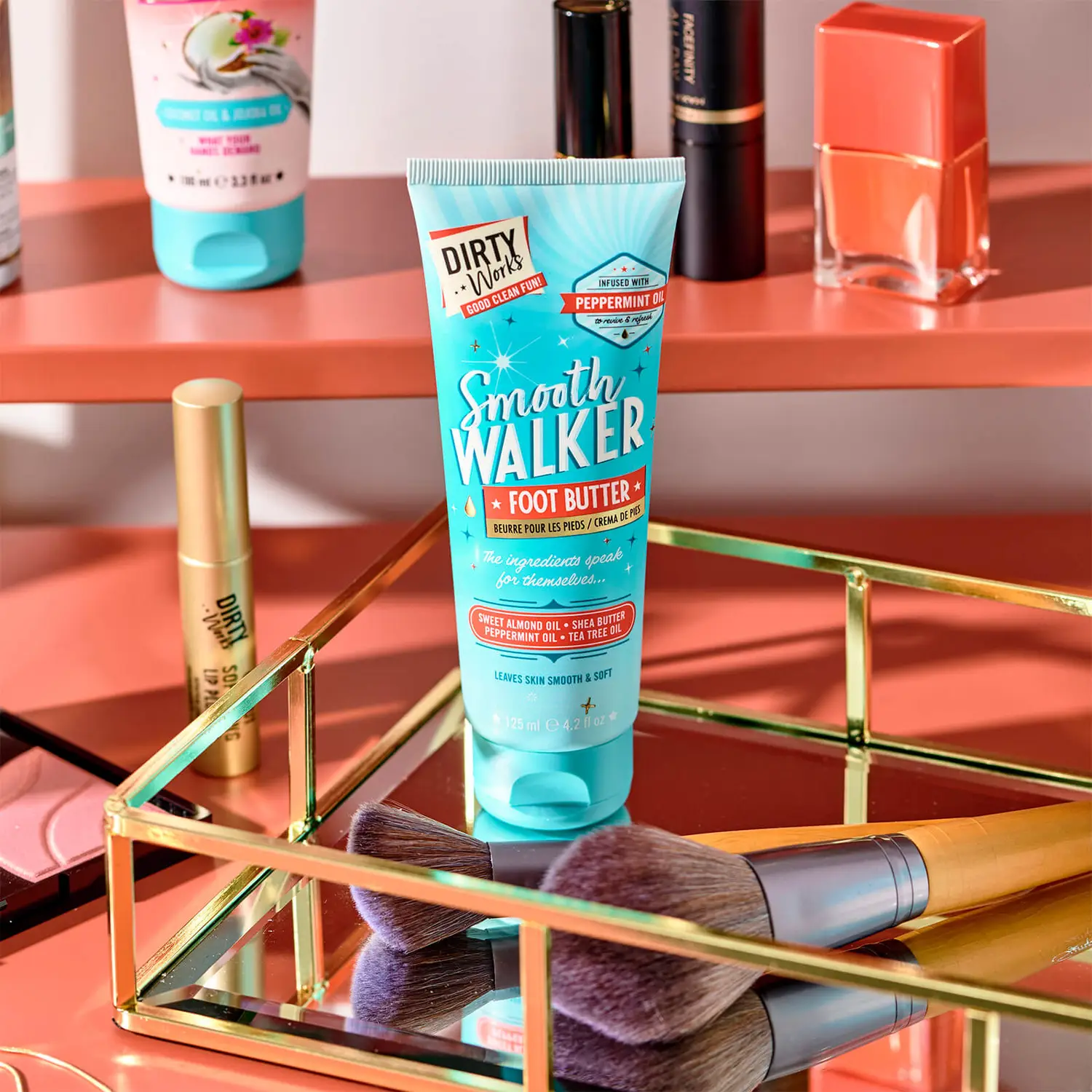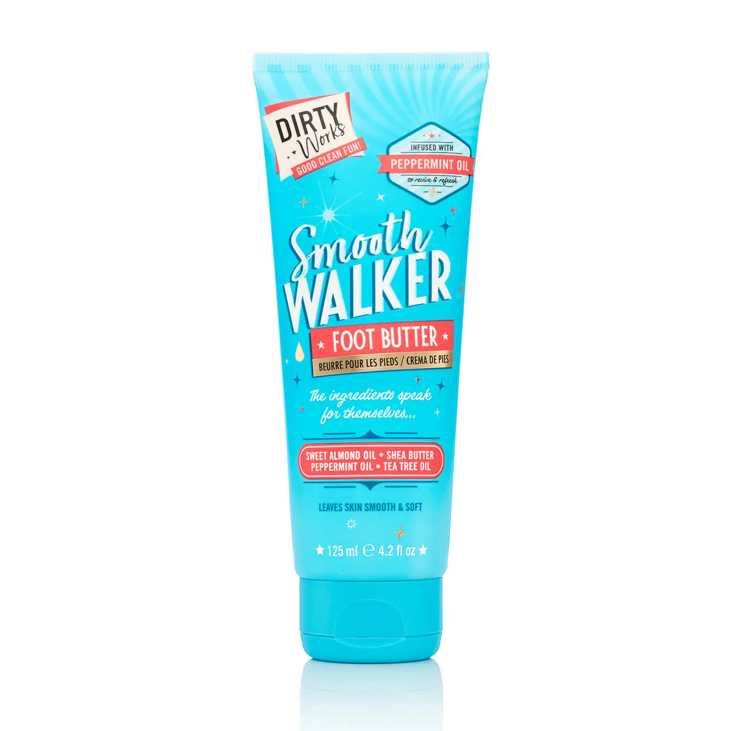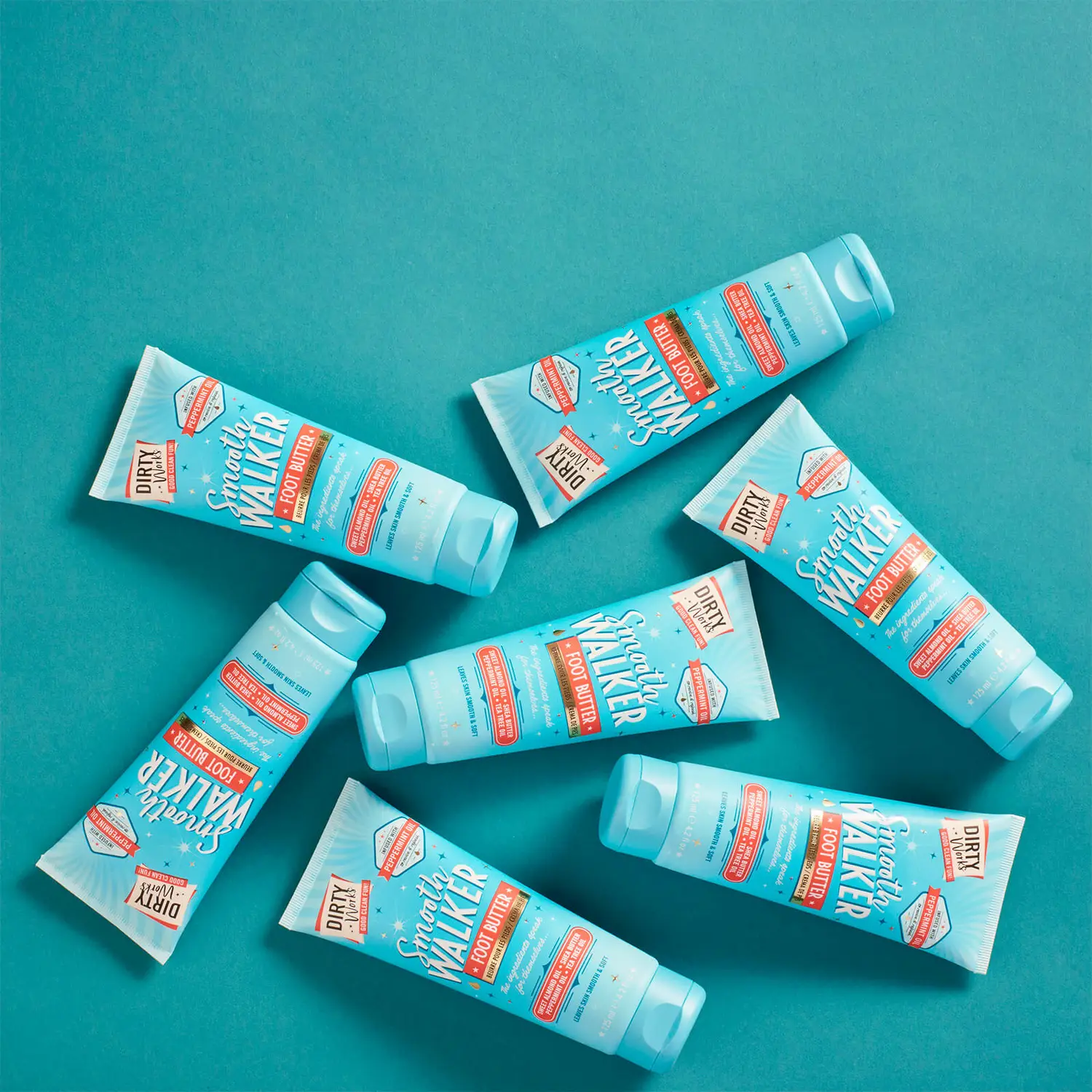 Get ready to fall head over heels for our super skin softening Dirty Works Smooth Walker Foot Butter. With rejuvenating Peppermint and cooling Tea Tree Oils to revive and refresh tired, hard-working feet.